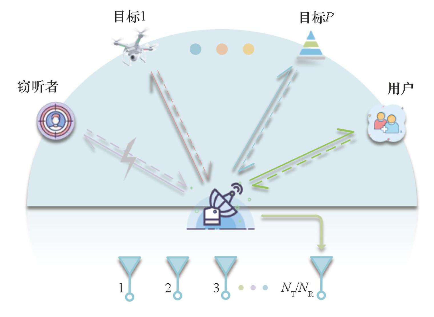 大连理工大学的李明教授等[107]针对敌方侦察信道状态未知场景,提出了一种基于人工噪声辅助的联合波束成形设计,利用系统闲置功率产生人工噪声,在保证通信与感知性能不受影响的前提下,增强对潜在侦察方的干扰,从而提升雷达通信一体化系统的安全性。