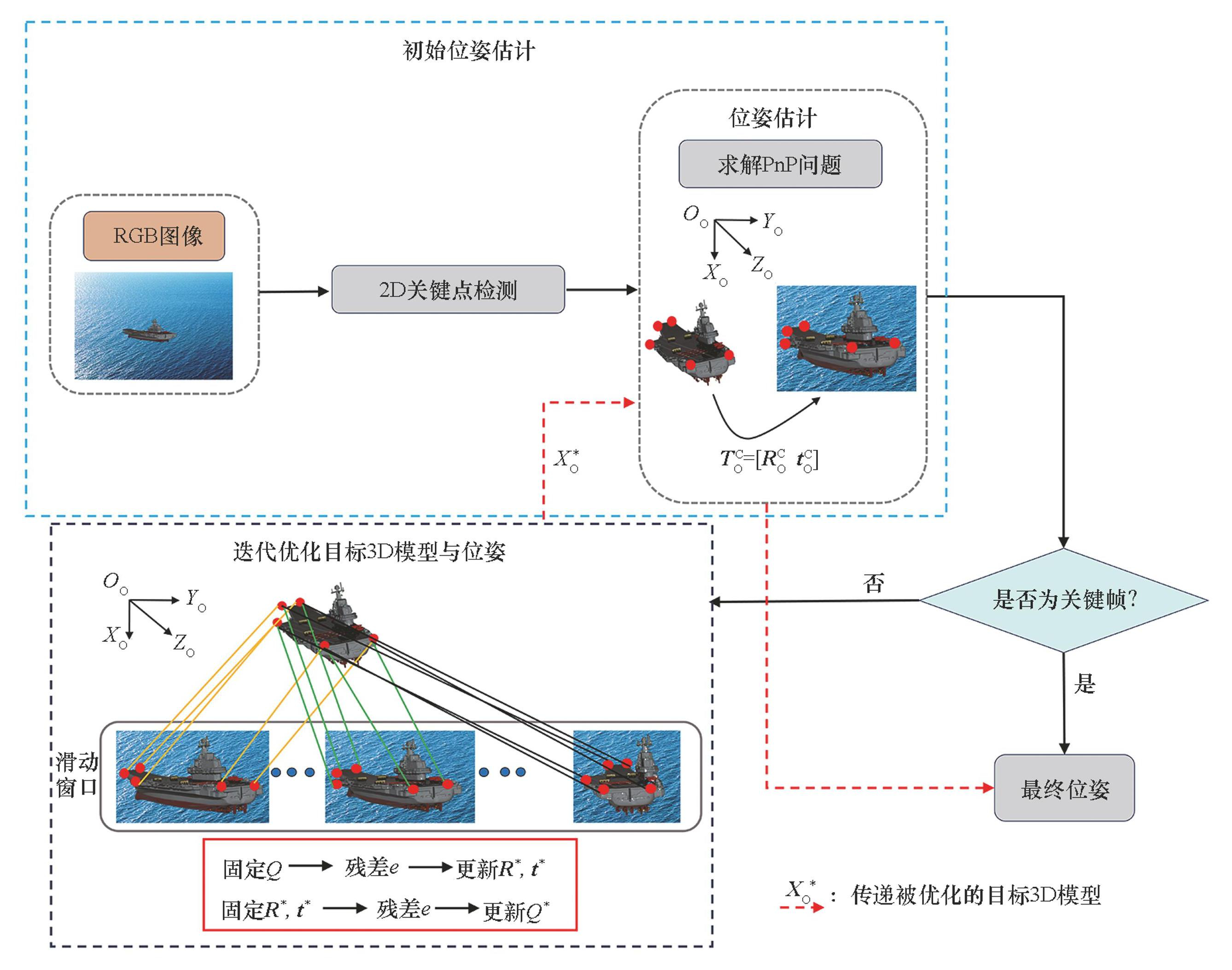 摘要:已有单目视觉引导中平台间位姿高精度测量方法需要准确的目标平台3D模型,无法消除3D模型误差给位姿测量带来的影响。针对此问题,对目标平台3D模型和位姿进行迭代优化,并提出一种新的单目视觉测量方法:采用稀疏3D关键点集合建模目标平台3D模型,利用序列图像中多视图几何约束信息,将目标稀疏3D关键点集合和6D位姿作为待求解参数,以最小化物方残差建立目标函数,通过求解该最优化问题,迭代优化稀疏3D关键点集合及位姿,通过采用滑动窗口结合关键帧筛选策略,实现实时、在线的高精度单目视觉测量。实验结果表明,通过迭代优化稀疏3D关键点集合及位姿,所提方法实现了目标平台3D模型不准确条件下实时、在线的高精度单目位姿测量,同时提升了目标3D模型精度。