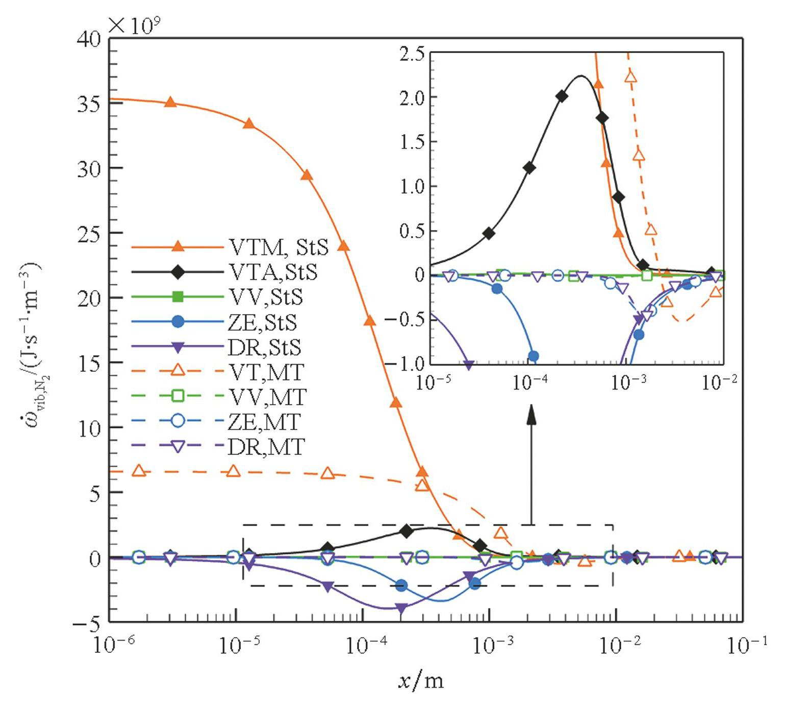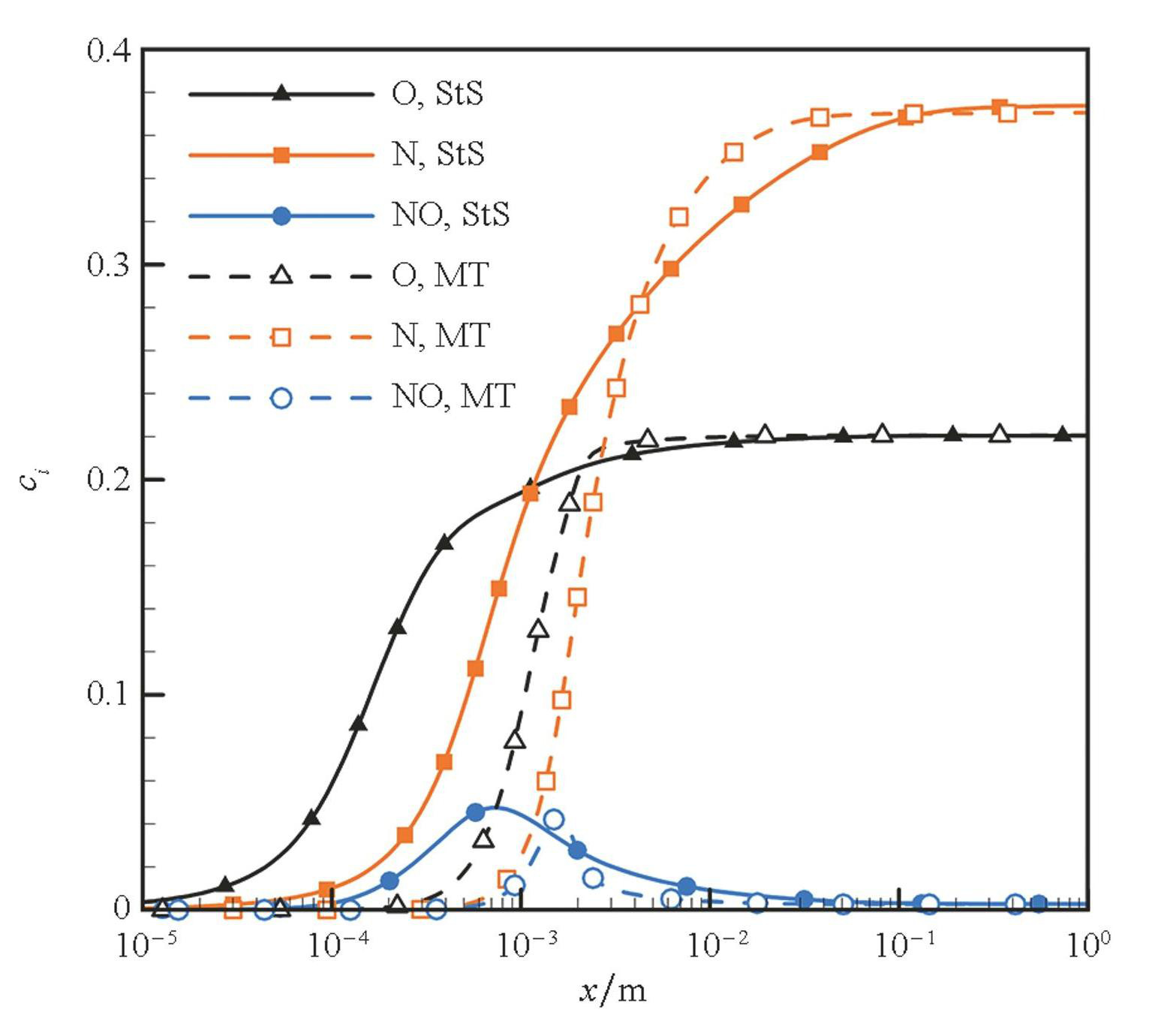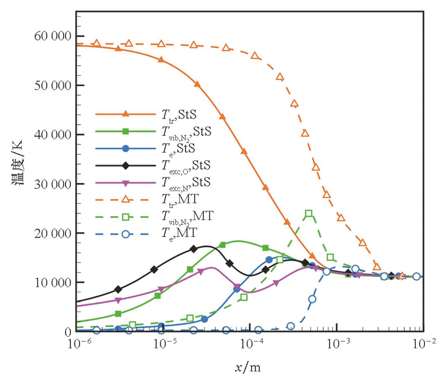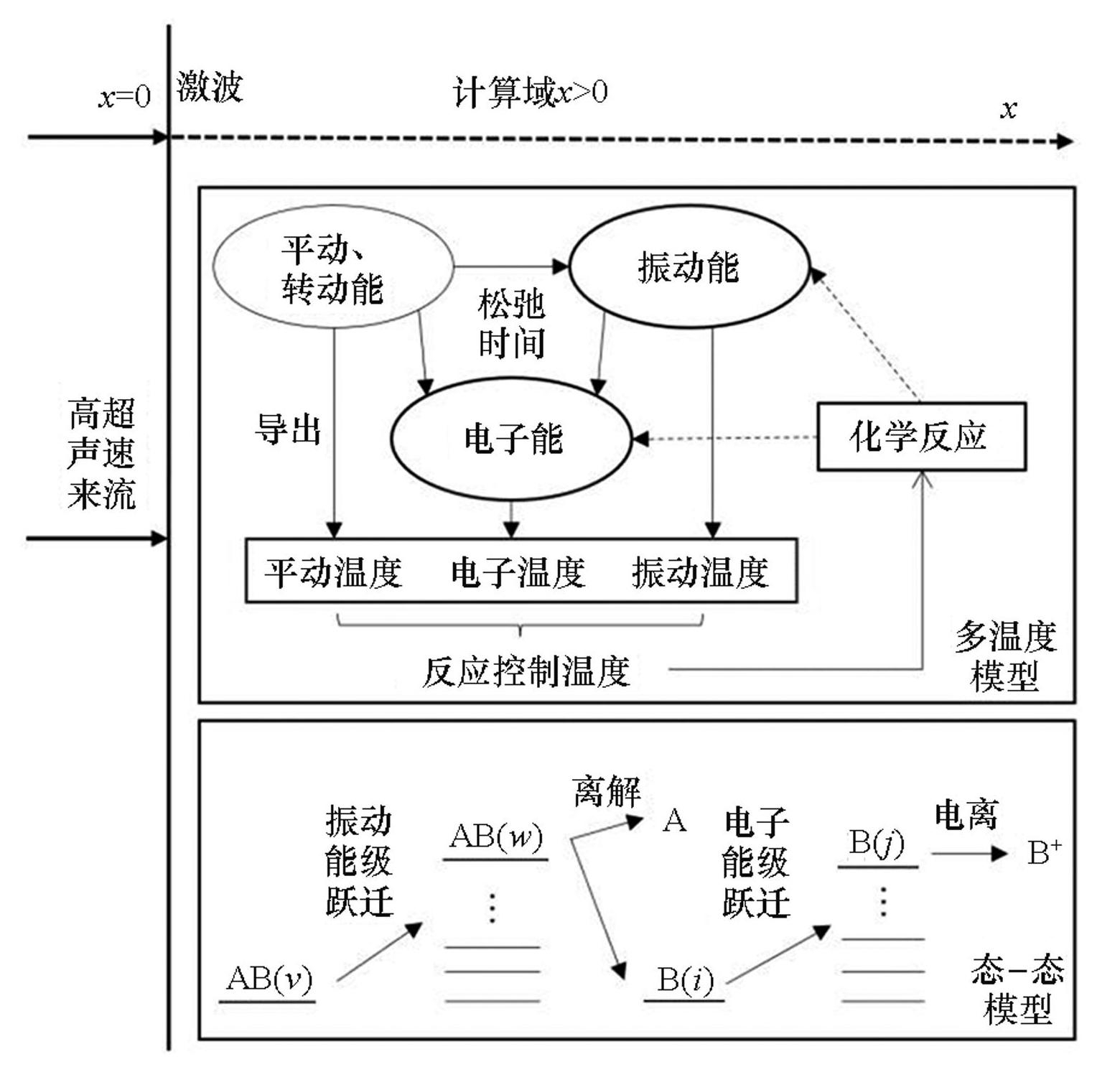 摘要:分别采用态-态模型和多温度模型进行11化学组元的高温空气正激波流动数值模拟与分析。态-态模型区分中性分子的振动能级和中性原子的电子能级;多温度模型区分平动-转动温度、各中性分子的振动温度和电子温度。波前气流速度5~11 km/s范围的模拟结果表明:在紧靠激波区域,由于离解和电离反应,分子高振动能级和原子高电子能级的分布低于对应温度下的玻耳兹曼分布;与态-态模型相比,多温度模型下振动能、电子能的激发和各内能模式的热平衡都更晚,化学反应更晚发生但更早结束;多温度模型预测的起因于化学反应的振动能损失偏小、起因于电子碰撞电离的电子能损失偏大,获得的各分子振动温度与电子温度不能准确描述粒子能级的非平衡分布。