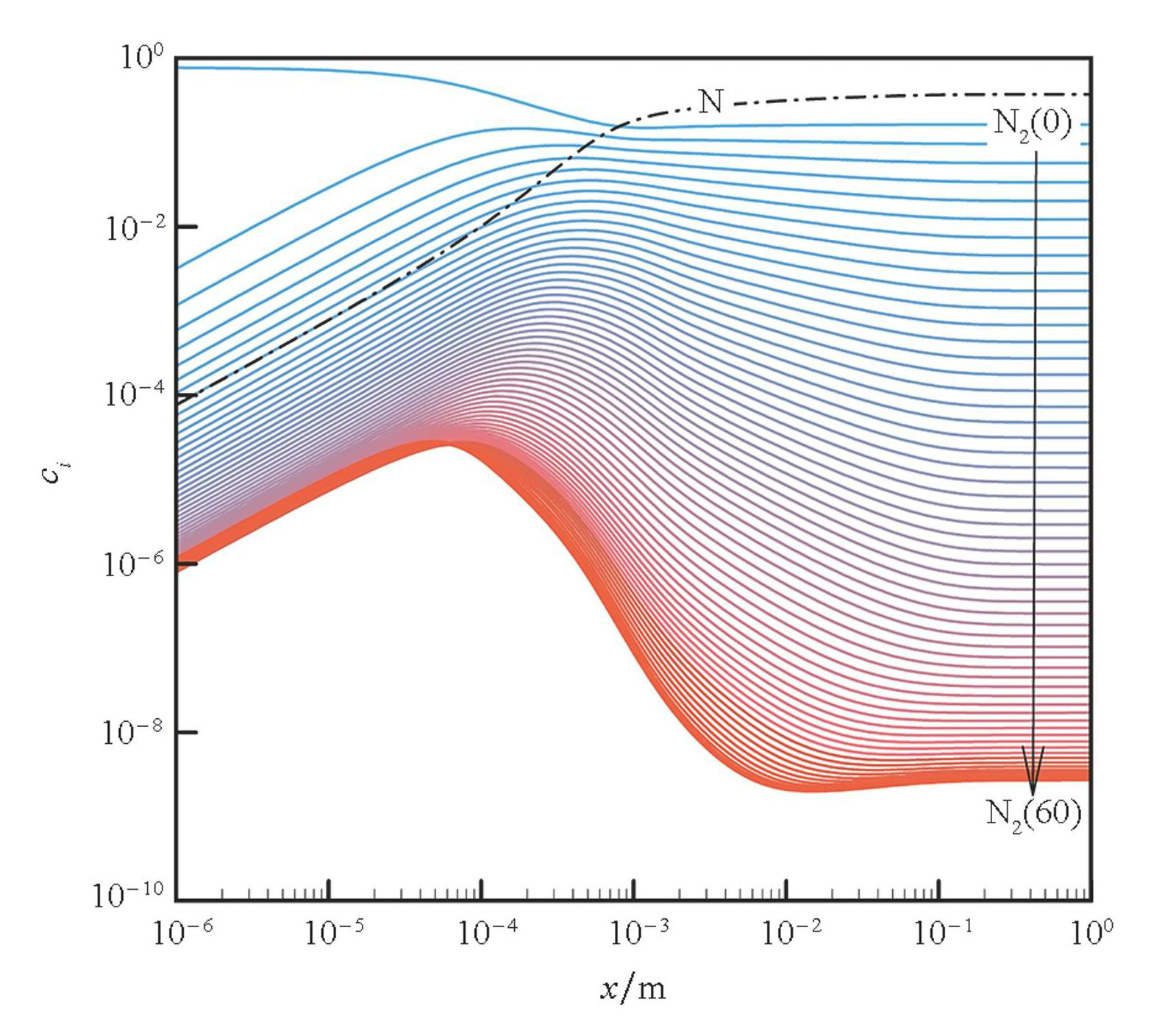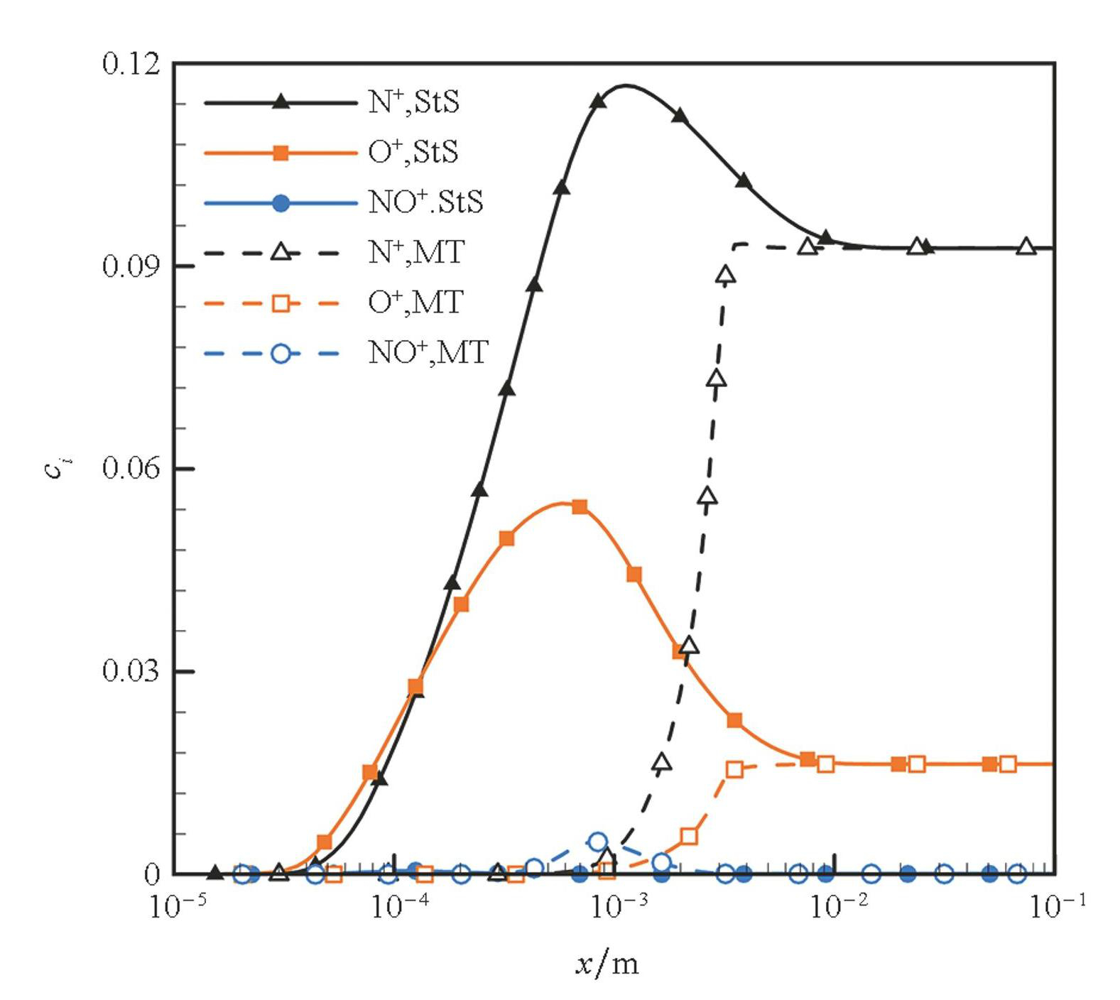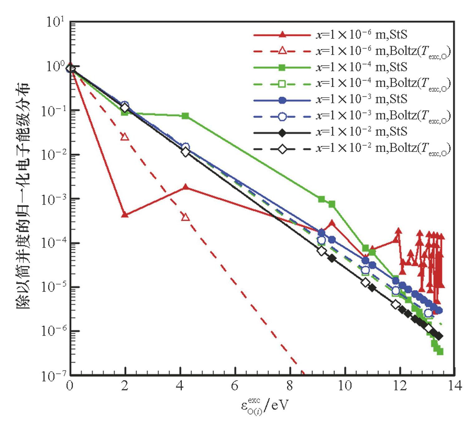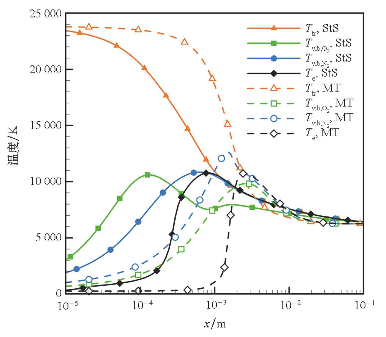 摘要:分别采用态-态模型和多温度模型进行11化学组元的高温空气正激波流动数值模拟与分析。态-态模型区分中性分子的振动能级和中性原子的电子能级;多温度模型区分平动-转动温度、各中性分子的振动温度和电子温度。波前气流速度5~11 km/s范围的模拟结果表明:在紧靠激波区域,由于离解和电离反应,分子高振动能级和原子高电子能级的分布低于对应温度下的玻耳兹曼分布;与态-态模型相比,多温度模型下振动能、电子能的激发和各内能模式的热平衡都更晚,化学反应更晚发生但更早结束;多温度模型预测的起因于化学反应的振动能损失偏小、起因于电子碰撞电离的电子能损失偏大,获得的各分子振动温度与电子温度不能准确描述粒子能级的非平衡分布。