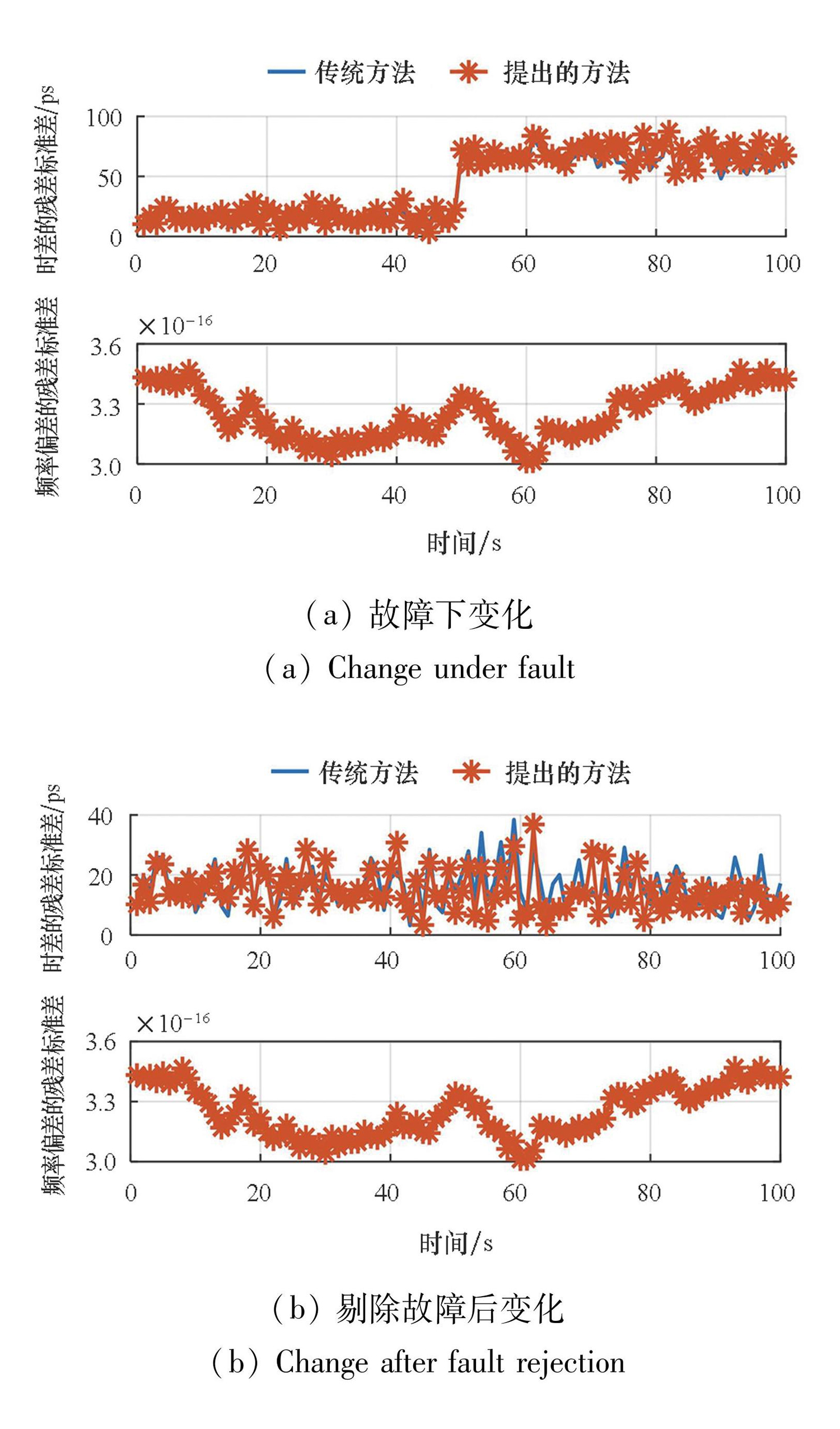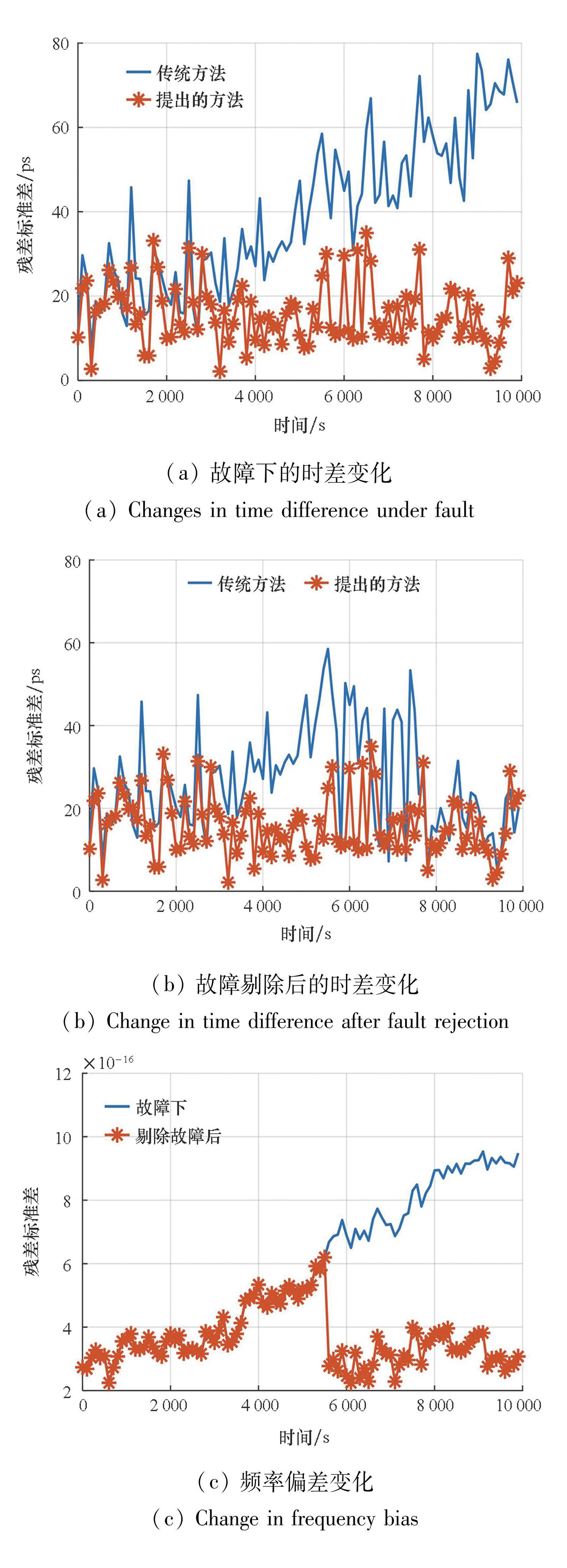 摘要:为了提升时频系统完好性监测的灵敏度,提出了一种基于抗差卡尔曼滤波器的时频系统完好性监测方法。该方法利用时差历史测量数据构建抗差卡尔曼滤波器模型,实时估计时差预报偏差与频率偏差,分别进行一致性检测,实现完好性监测。通过实测数据与仿真分析对该模型与方法进行验证,结果表明:该方法可以有效地检测与识别相位跳变和频率跳变单故障,并向用户告警;在单故障场景下,相比传统的完好性监测方法,检测灵敏度提升约25.0%;在多故障场景下,该方法能有效检测故障,但存在识别故障不充分的问题,检测灵敏度相比单故障降低约26.2%,仍优于传统方法。