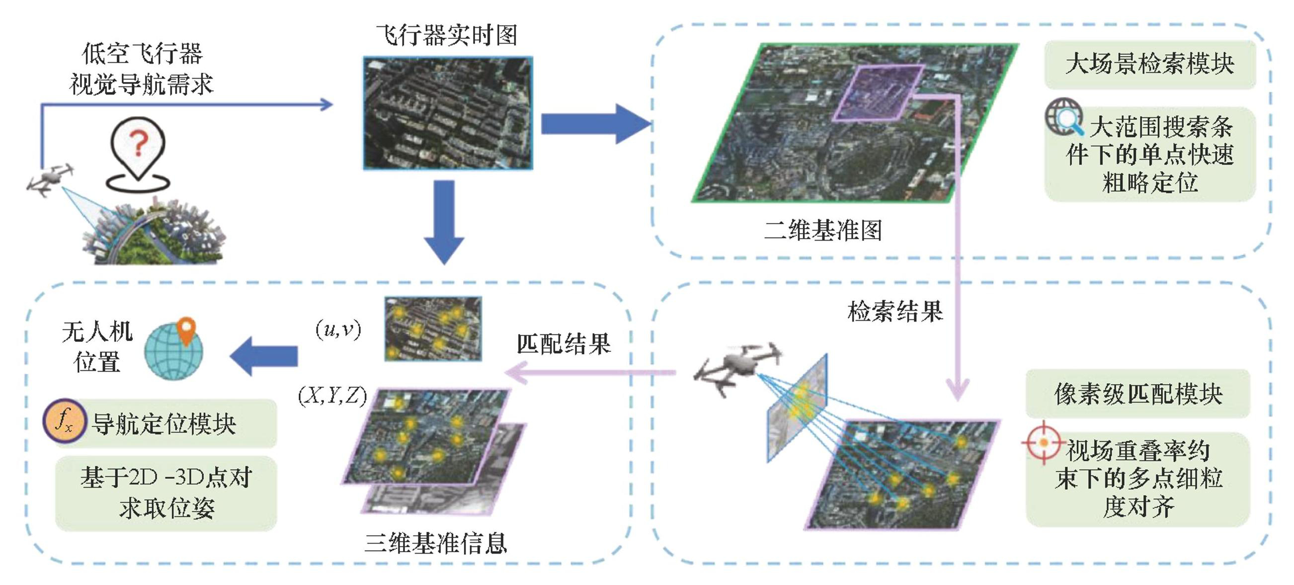 摘要:针对低空无人飞行器在全球卫星导航系统(global navigation satellite system,GNSS)拒止环境下自主定位的迫切需求,系统综述了基于“检索—匹配—位姿解算”框架的飞行器绝对视觉定位技术。讨论了低空观测带来的成像差异、场景尺度变化和地物遮挡等问题,阐明了该分层定位框架在解决大范围、长航时定位问题上的技术优势。在此基础上,分别从跨视角图像检索、像素级特征匹配及飞行器位姿解算三个核心模块,系统梳理了从传统手工特征到深度学习范式的技术发展趋势与研究现状。结合机载边缘计算平台的部署需求,分析了现有技术局限并展望了未来研究方向。本综述可为低空飞行器绝对视觉定位的技术研究与工程应用提供参考。