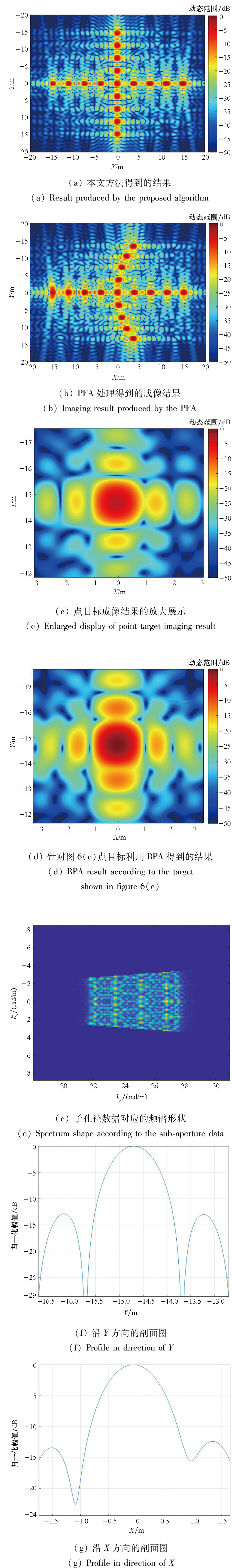 鉴于人们习惯于对径向与横向呈正交状态的图像进行评估,表2中4类模式的转角区间均以90°为中心,并采用PFA和BPA对比不同算法的成像结果。边缘散射点对应最大的成像半径。图6展示了模式1对应的成像结果,图6(a)表示利用本文算法处理得到的散射点成像结果;图6(b)对应PFA处理得到的成像结果;图6(c)代表图6(a)中边缘点(0 m,-15 m)对应的点散布函数分布;图6(d)为图6(a)中边缘点(0 m,-15 m)对应的BPA成像结果;图6(e)为图6(a)的频谱支撑域;图6(f)和(g)分别表示图6(c)所示点散布函数沿横向(Y)和径向(X)的剖面图。