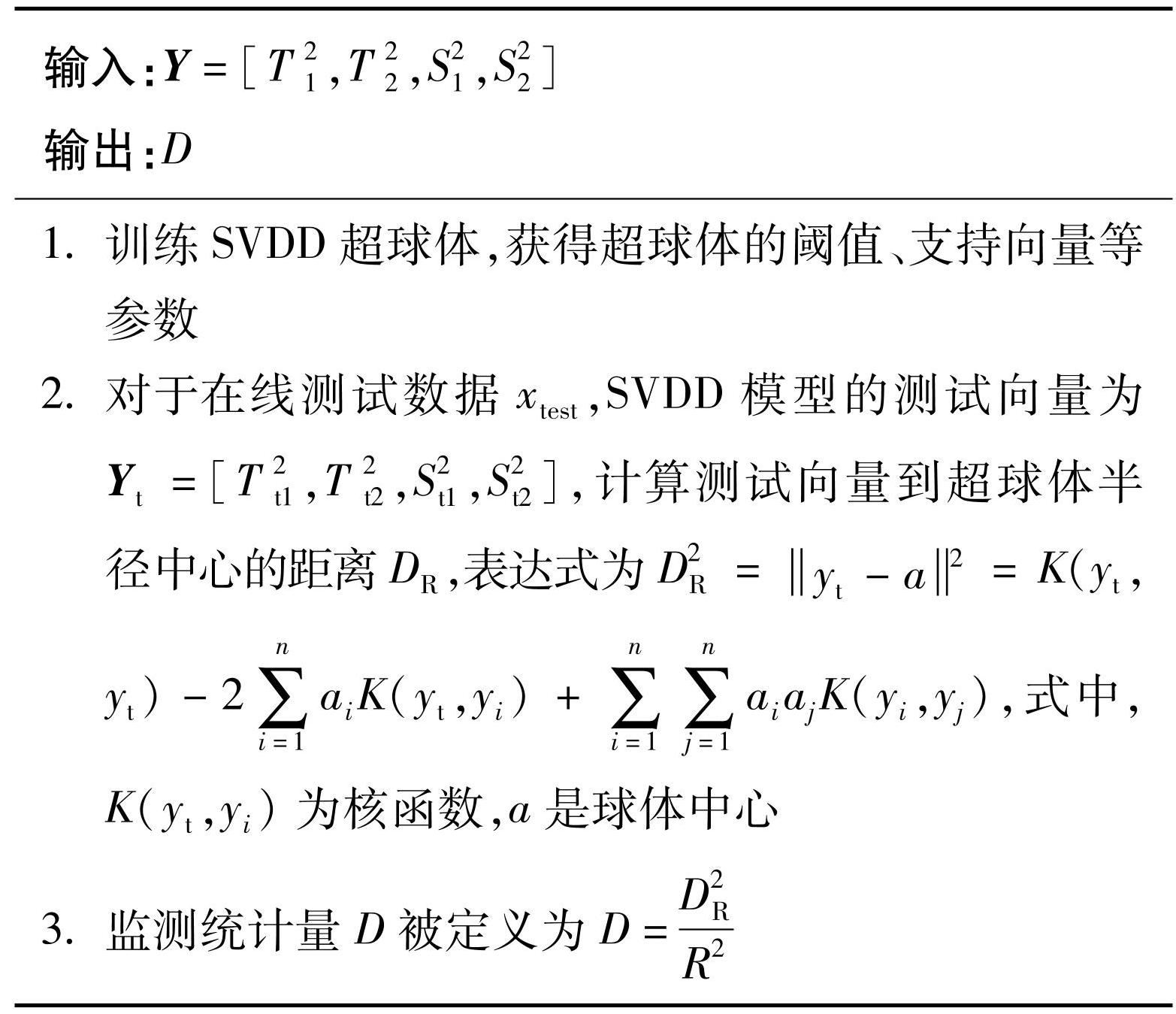 根据定义式分别得到子块对应的阈值和测试样本,由于多个统计量很难同时被监测,利用支持向量数据描述(support vector data description,SVDD)集成策略将子块结果转换为更加直观的监测指标。将阈值Y=[T21,T22,S21,S22]作为输入,建立SVDD模型,如算法2所示,进行融合。
