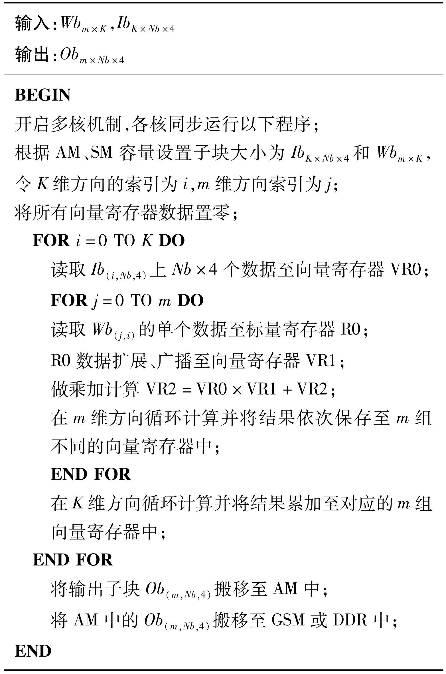 令子块Wb为m×K,Ib为K×Nb,分块思路如下:①结合处理器结构特点,考虑到处理器指令的延迟槽循环和流水线排布,Wb的m取6~12较为合适;②确立好m,判断当K=Ci时权值的子块是否满足SM的存储空间要求,若否,则将Ci按二分法继续切分直至满足SM存储空间要求;③输入数据分块中首先将Nb设为192,结合Wb的取值K判断K×192是否符合AM存储空间要求,若是,则继续以192为倍数扩大Nb,直到取到范围内的最大值,若否,则在K上按二分法继续切割,直到满足存储要求为止。