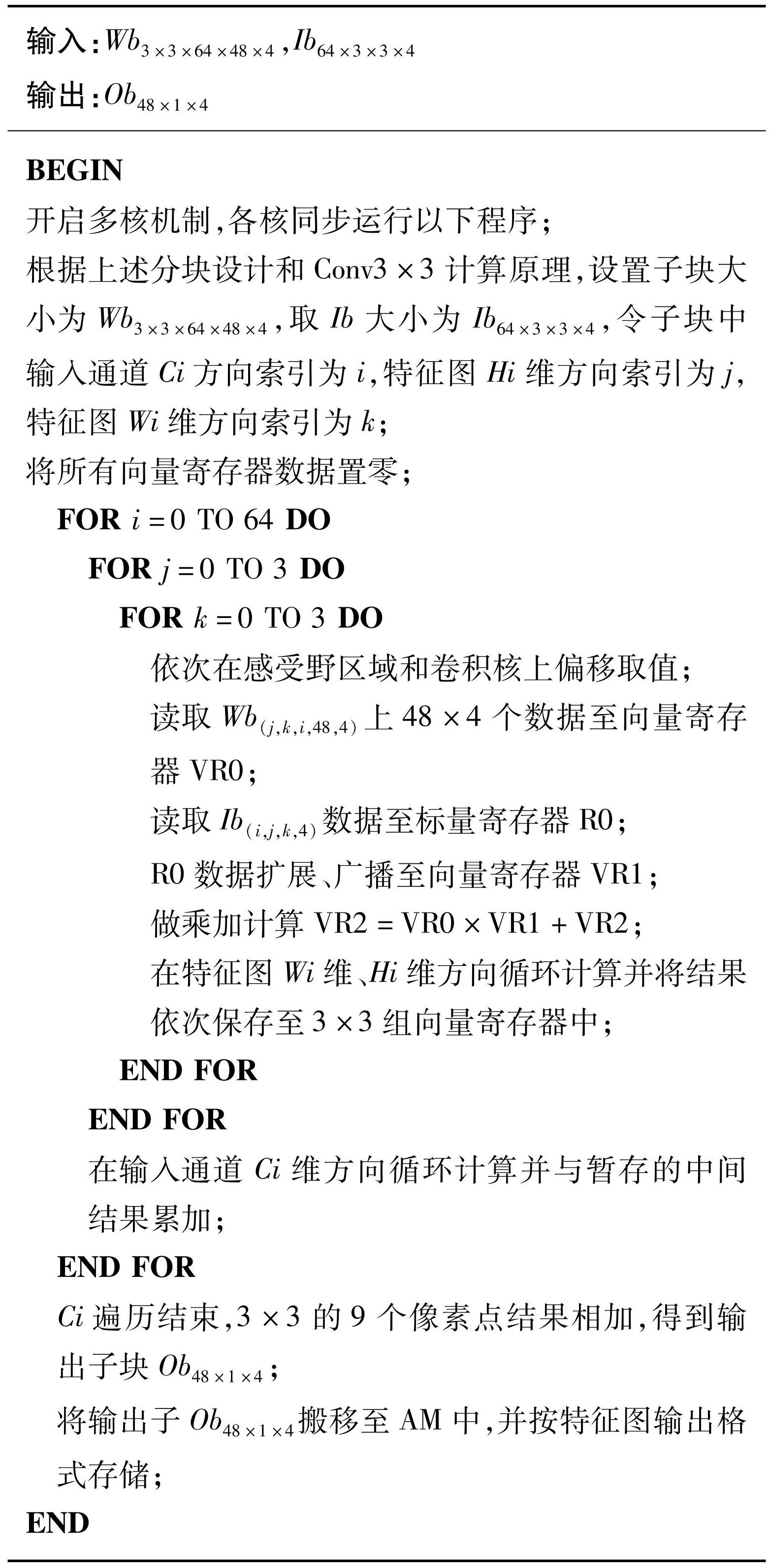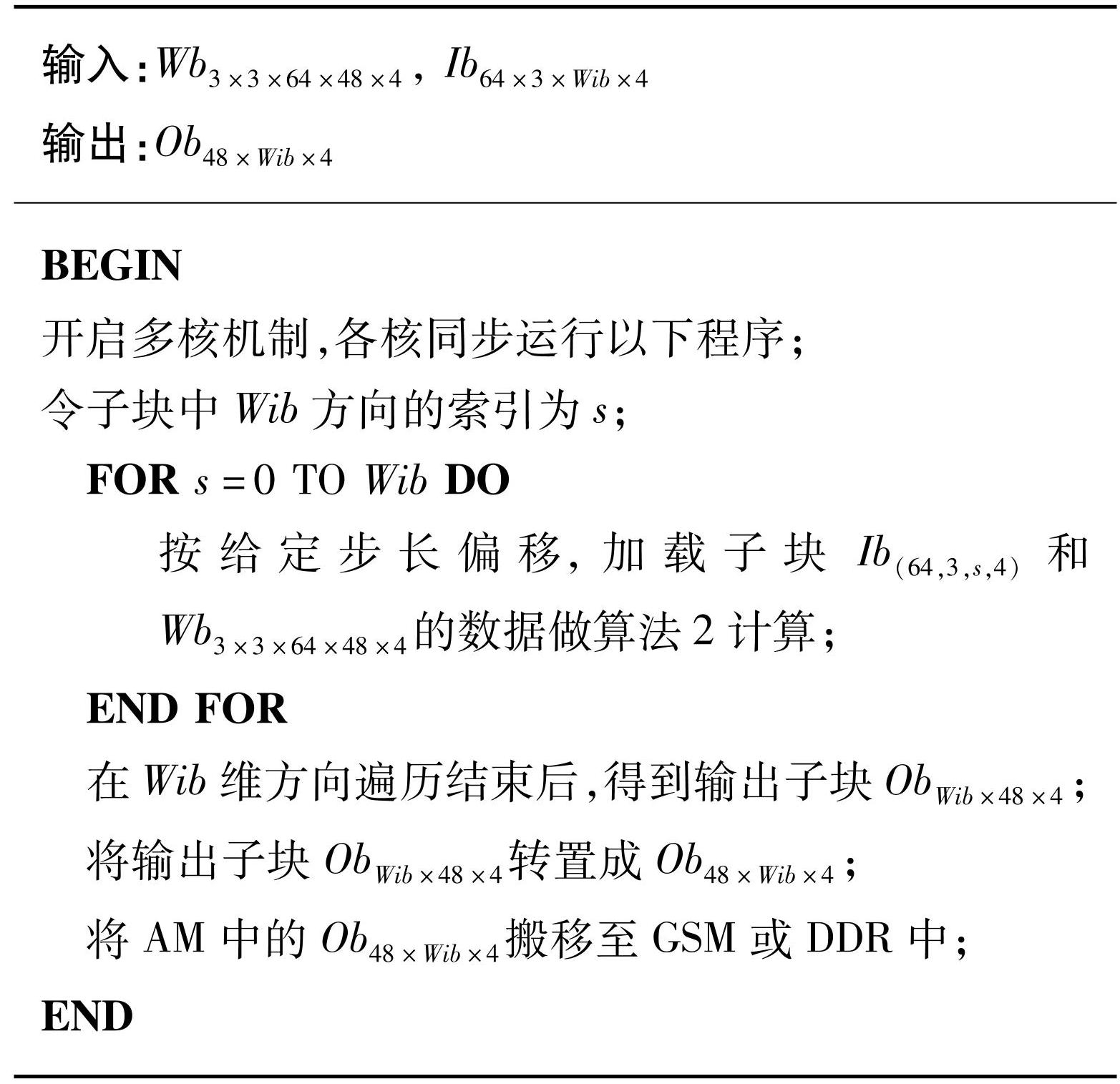 单元素计算完成后,需要按序依次对输入子块Ib中的其他元素做卷积,根据上述设计已知子块为Wb3×3×64×48×4和Ib64×3×Wib×4,得到的输出子块为Ob48×Wib×4,算法实现见算法3。