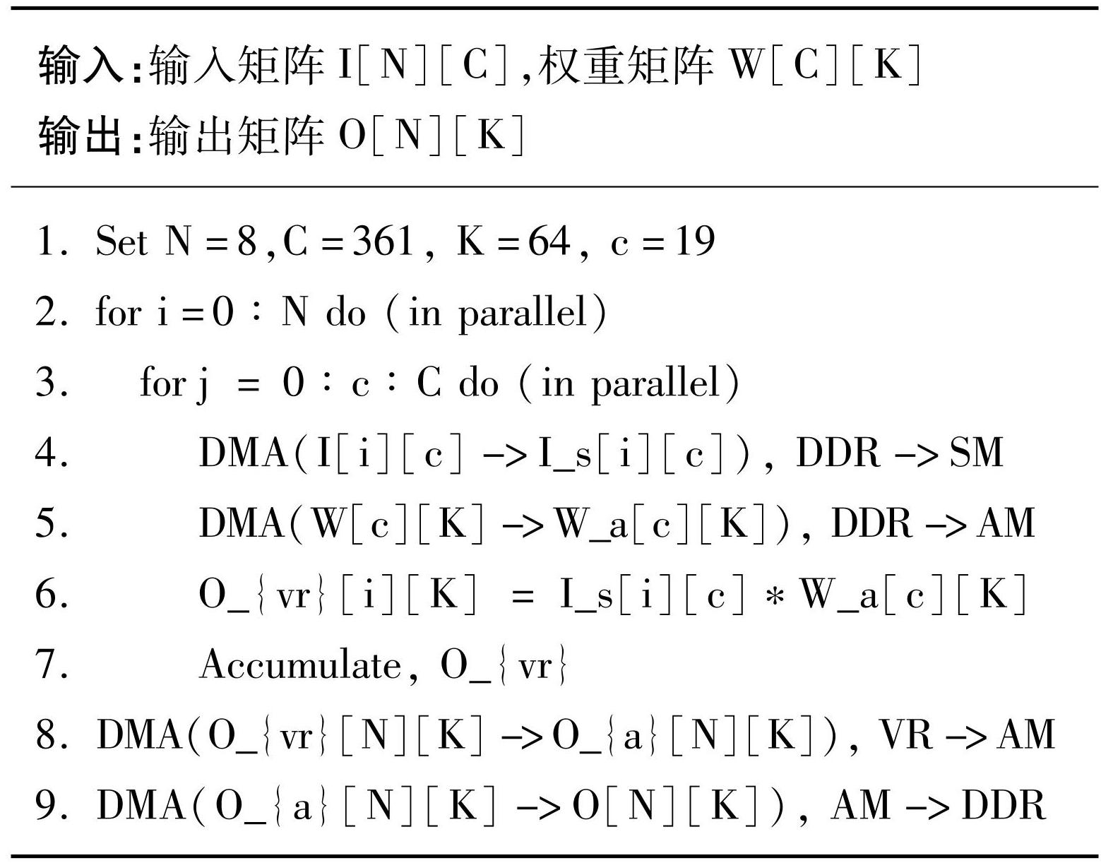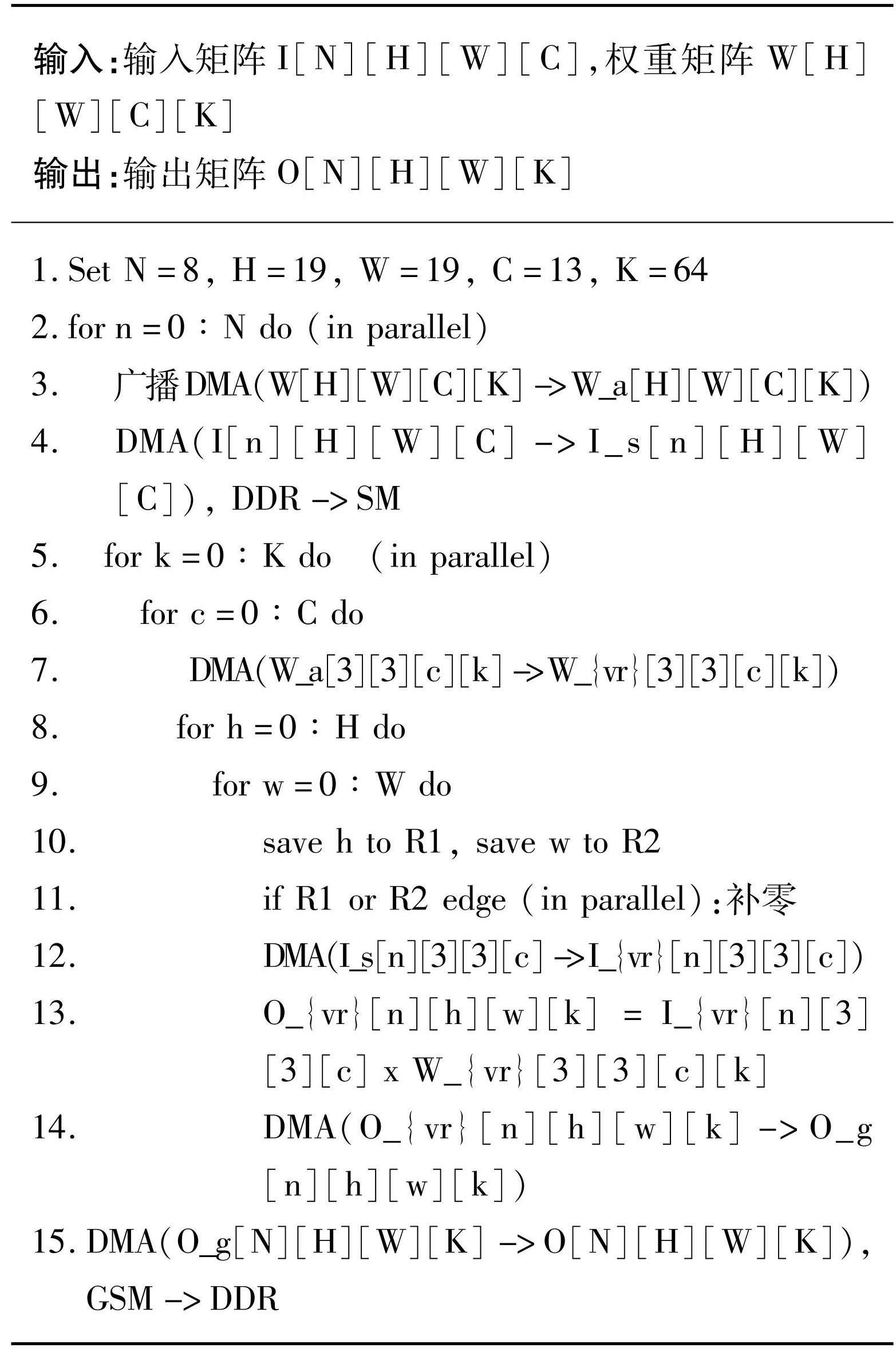 把O通过DMA输出到DDR中。分析上述计算过程的并行性。在算法3的步骤2利用8个核在N维上实现并行。在步骤5利用多VPE和多寄存器,在K维实现并行。在步骤11,乘累加需要6个指令周期,跳转指令需要7个指令周期,同时进行这2个指令,从而覆盖部分进行边界判断的消耗。本文方法的卷积算子在汇编过程中利用多核、多VPE、多寄存器、指令周期重叠实现了并行计算。