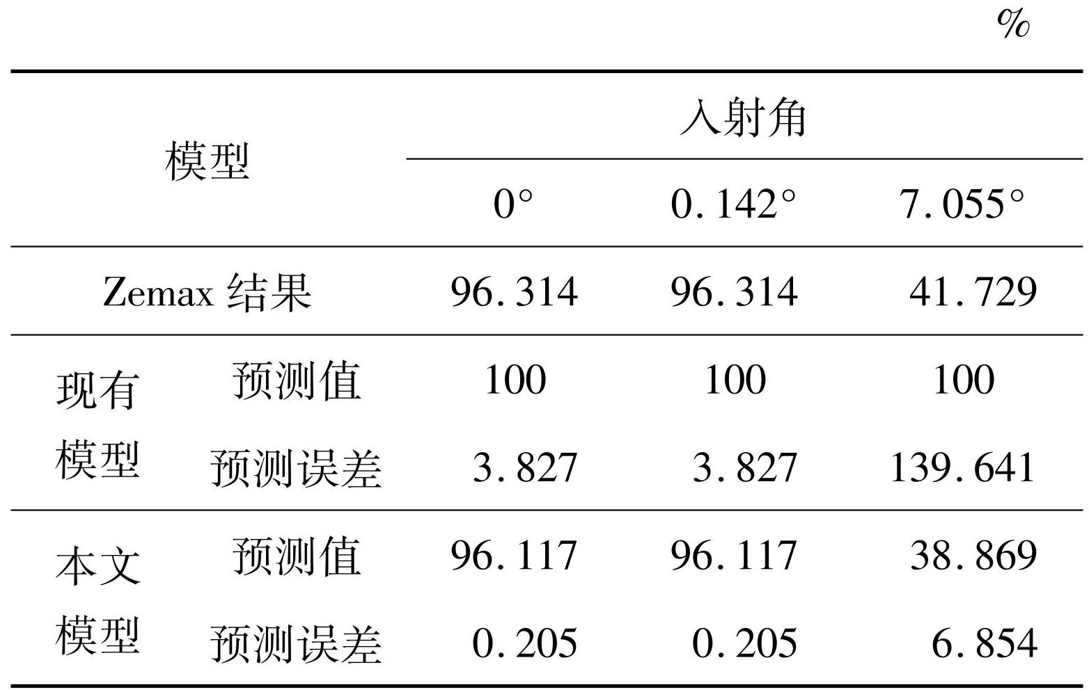 表3无离焦情况下最大入射角的模型预测误差