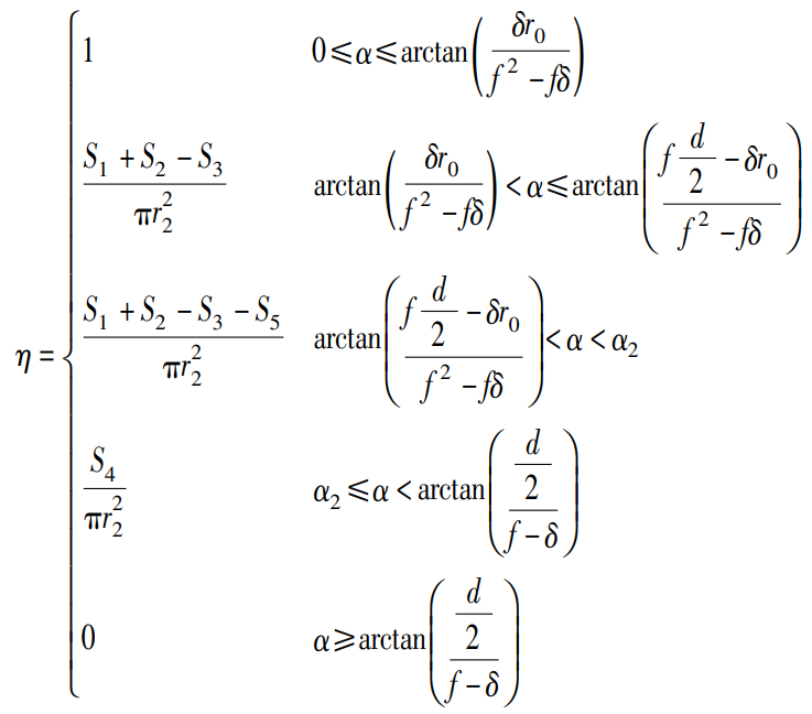 2)当时(为能够产生猫眼效应的最大入射角),在透镜2平面处,传输至此的激光束在没有光阑遮挡的情况下,覆盖以O′为圆心的圆形区域,然而光阑2将激光回波限制在以O为圆心的圆形区域内。此时,回波形状为两圆交集,回波效率为两圆交集的面积与以O′为圆心的圆形面积之比。随着α逐渐增大,两圆交集的面积随之减小,回波效率也随之降低。