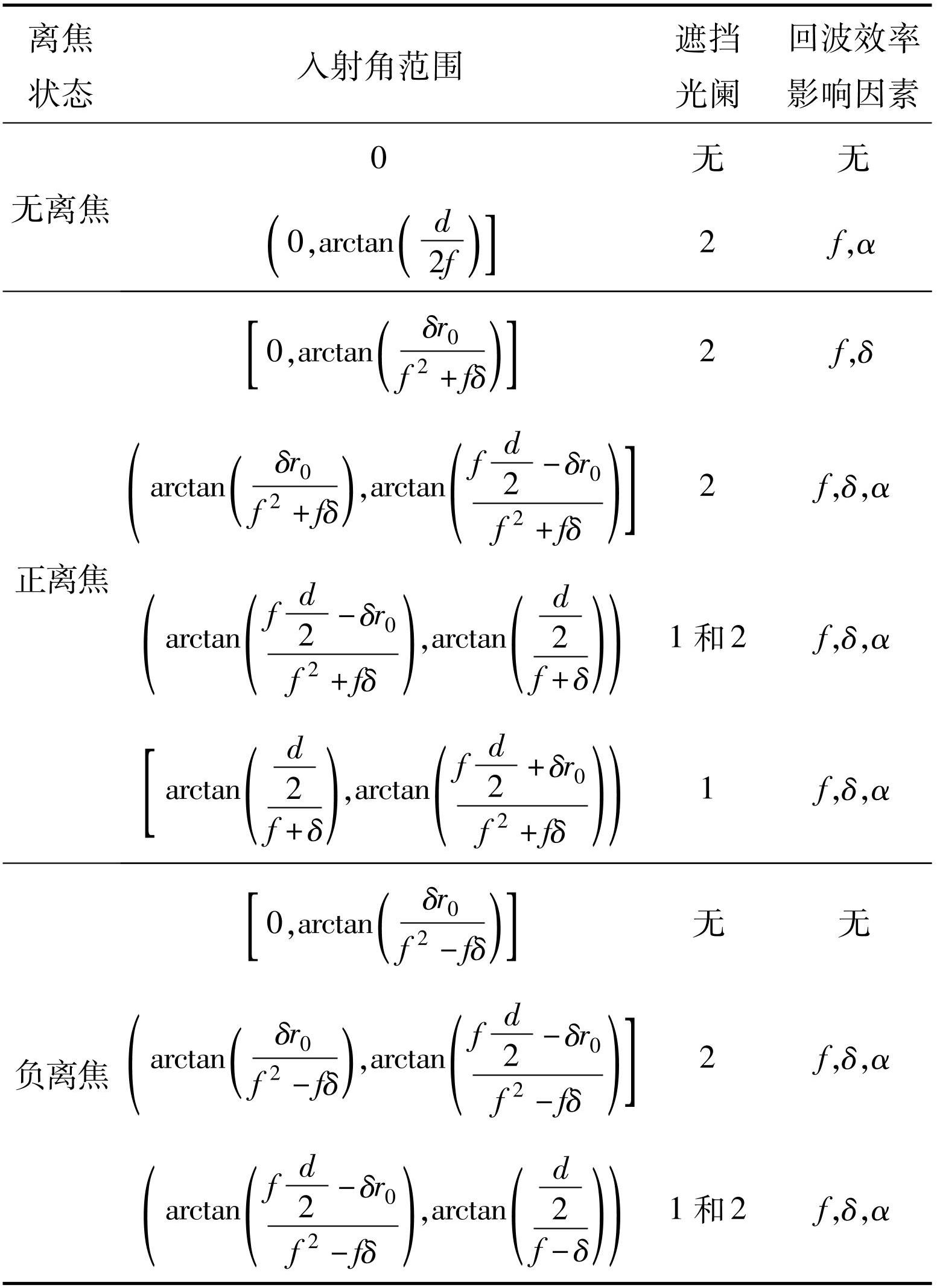在不同离焦情况下,随着入射角增大,光阑遮挡的作用机制与回波效率的影响因素如表1所示。分析可知,在可产生猫眼效应的入射角范围内,光阑2是导致回波效率降低的主要因素,而光阑1产生影响时,入射光焦点已接近分划板的边缘位置,其影响的入射角范围较窄。