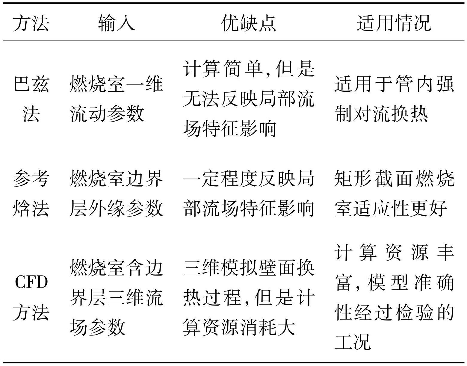 巴兹法与参考焓法采用准则关系式的方式来计算燃气与壁面的对流换热,巴兹法采用的是一维质量加权流场作为输入条件,对于管内强制对流换热的模拟更加适用,但是无法较为准确地反映燃料喷雾雾化、燃烧时滞、边界层厚度变化等特殊的燃烧与流动现象对热流的影响。参考焓法适用于高速气流的平板边界层流动传热,对于超燃冲压发动机这种矩形截面燃烧室的适应性较强,但是需要提供燃气内流边界层外缘的流场参数,边界层外缘流场参数通常数值求解三维内流场。CFD模拟方法可以较为准确地模拟燃气与壁面的换热过程,但是一方面需要消耗较大的计算资源,在工程应用中需要考虑其时间与经济成本;另一方面,其精准度高度依赖物理与数学模型的精准度,比如化学反应和湍流模型的准确性和适应性等,对于超出现有能力的复杂工况,准确性仍需检验,表1给出了三种方法燃烧室输入对比。