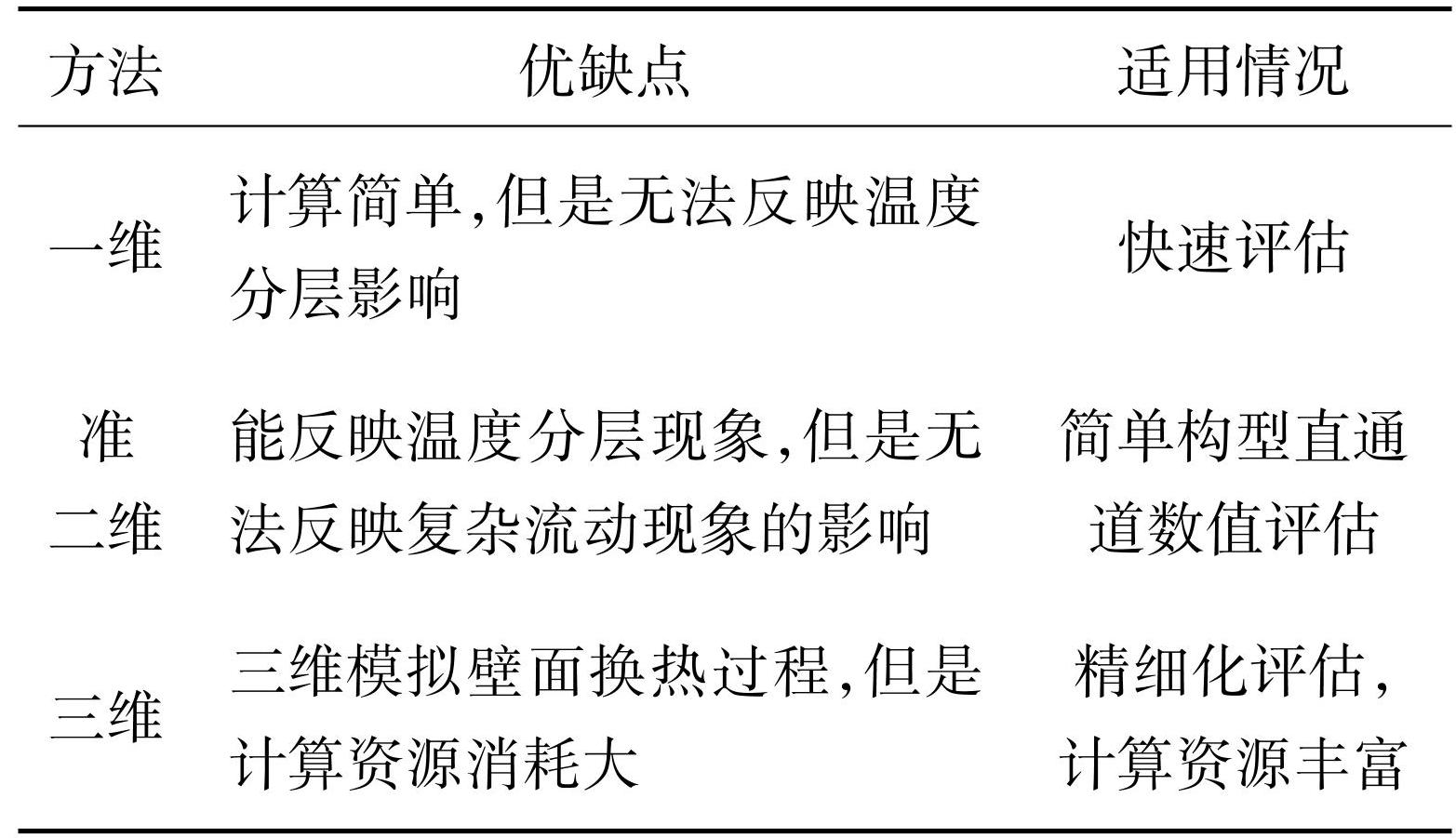 一维计算模型对实际传热过程进行了大量简化,计算简单,但是忽略了冷却通道内流体热分层现象,随着冷却通道深宽比增大,温度分层现象更加明显,采用一维模型计算获得的冷却效率偏低。采用准二维模型能较好地模拟温度沿径向的分层现象,且计算效率远高于三维模型,但是对于U型[40]或带肋条[34]的复杂构型冷却通道,准二维模型无法模拟冷却剂在层间的质量与动量传递过程,因此无法模拟由层间扰动带来的强化传热效果。此外,一维和准二维模型都高度依赖选取的换热准则关系式,但是准则关系式通常都是基于试验结果总结归纳形成的,有一定的适用范围,当超过适用范围时会存在较大的偏差。三维模型能够较好地模拟加热不均而导致的温度分层现象以及波纹、肋条等形貌变化导致的扰动、回流等现象,计算精度显著提高,但是三维模型计算耗费时间长、计算成本高、难以满足方案迭代和优化对时间以及计算成本的要求,因此在飞行器热评估中一维的节点热分析方法仍然被广泛使用[41],表2给出了三种冷却通道计算方式对比。