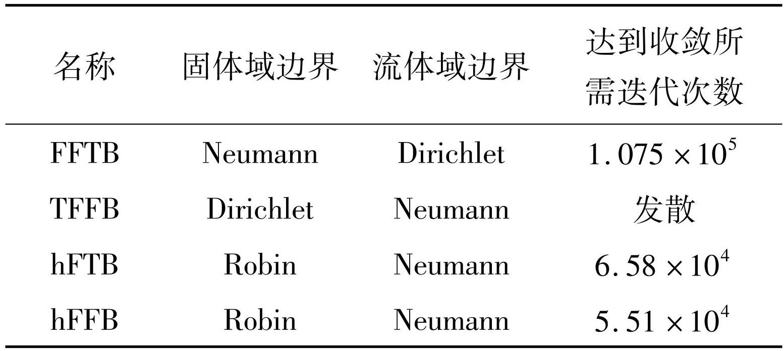 戎毅等[19]、赵超凡等[64]采用基于连续性边界的双向弱耦合迭代计算方法,模拟了燃烧室和冷却通道特征参数对耦合传热的影响。浦航等[65]通过改变流固交界面的热边界条件,分析不同耦合策略对计算结果的影响,包括FFTB(flux forward temperature back)、TFFB(temperature forward flux back)、hFTB(heat transfer coefficient forward temperature back)、hFFB(heat transfer coefficient forward flux back),相关信息如表3所示,具体含义以FFTB为例表示先采用热流边界作为固体域边界加载求解固体域,随后采用温度边界作为流体域边界求解流体域,类似地,hFTB表示先采用第三类边界作为固体域边界加载求解固体域,随后采用温度边界作为流体域求解流体域。研究发现TFFB(流体域Neumann边界、固体域Dirichlet)方法得不到收敛解,而Robin边界条件则可以提高计算的稳定性。Frey等[66]采用自研的轴对称雾化燃烧程序与商业CFD相结合的方式,以壁面为耦合面分析了燃烧流场特性。