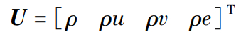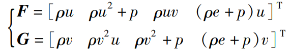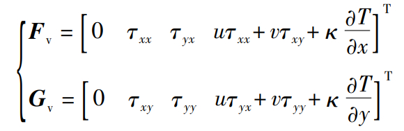 其中,U为守恒型状态变量,F、G、Fv、Gv分别为流向、法向的通量及相应黏性项,t为时间变量,x、y分别为流向和法向的空间坐标。各项具体表达式如下: