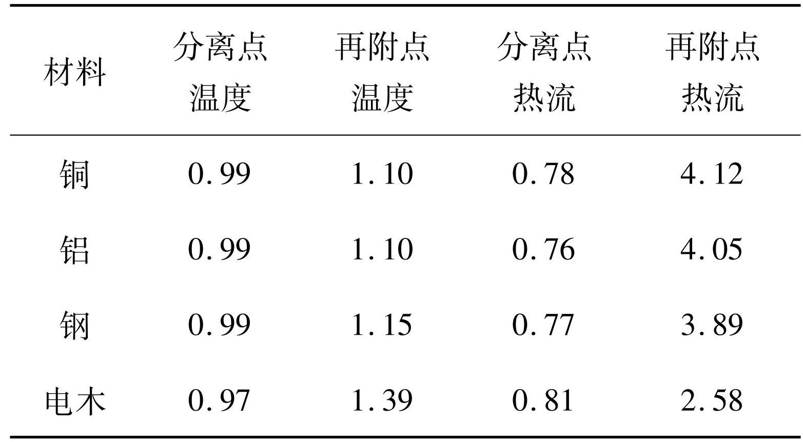 1)壁面材料为热扩散系数较大的铜、铝和钢时,气动加热时间t=10 s下的分离区长度仍与等温壁结果相当,而对于热扩散系数较小的电木材料,分离区长度明显增大,但小于绝热壁结果。