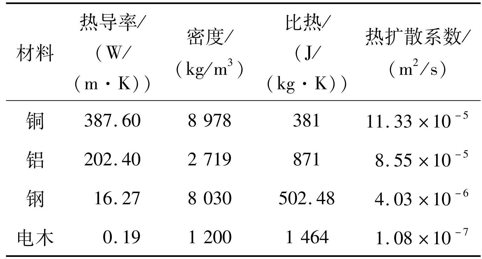 式中,ρs、cs、λs分别为固体材料的密度、比热、热导率,选择铜、铝、不锈钢、电木进行计算,不同材料的热物性参数如表1所示。其中,热扩散系数为热导率与密度和比热的乘积之比,用于表征物体温度变化的快慢。热传导方程采用中心差分离散,采用经典一阶Runge-Kutta方法对时间进行离散。