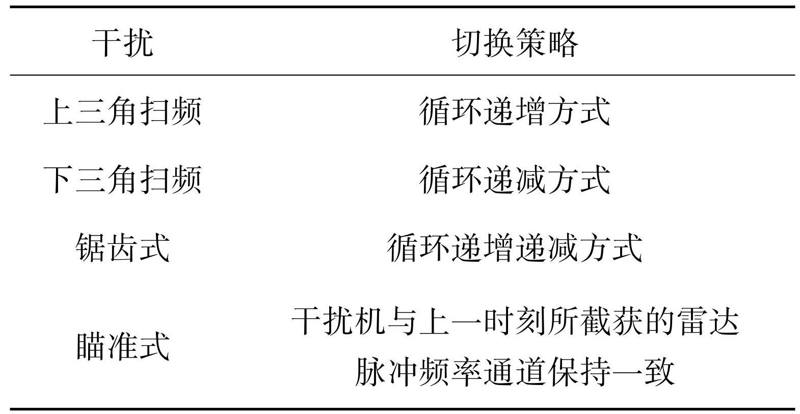 表1为己方雷达及敌方干扰机系统参数,表2为敌方干扰机采用的有源压制干扰频率扫描策略,表3为有源干扰识别器卷积神经网络具体参数。