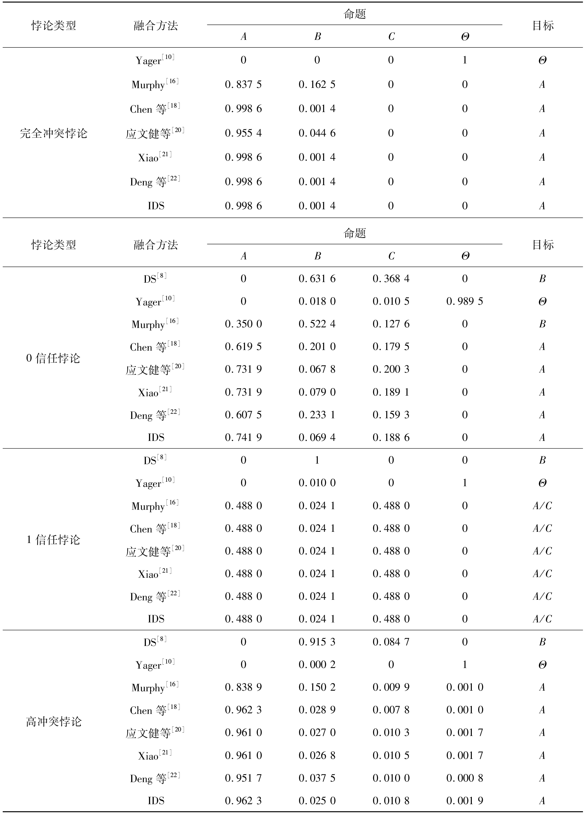 为验证所提改进DS(improved dempster-shafer,IDS)证据融合方法的可行性,以文献[29]中的四种典型高冲突证据悖论为数值案例,分别应用IDS和当前多种DS改进方法进行证据融合并对比分析融合结果。由于本文引入了信息熵,已知当某一命题的BPA为0时,取对数计算的结果无意义,为避免这种情况,使用1×10-12这种很小的数替代0,证据融合的结果不变[30]。四种典型高冲突证据的数值案例分别为: