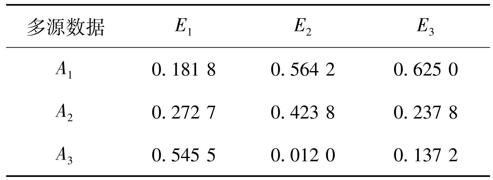 此时冲突系数k=0.973 1,表明该组证据为高冲突证据,其中,证据1和证据3均支持数据A1,说明这两个证据均认为数据A1在多源数据融合时的权重应最大,证据2支持数据A2,说明证据2认为数据A2的融合权重应最大。根据融合结果应与证据保持相对一致的原则,正确的融合结果应赋予数据A1最大的融合权重,但实际的融合结果为m(A1)=0,m(A2)=0.631 6,m(A3)=0.368 4,数据A2的融合权重最大,为0.631 6,而数据A2的融合权重却为0,显然与事实相悖,表明此时DS证据理论无法正确融合维修性多源冲突数据,因此,需要对DS证据理论进行针对性改进。