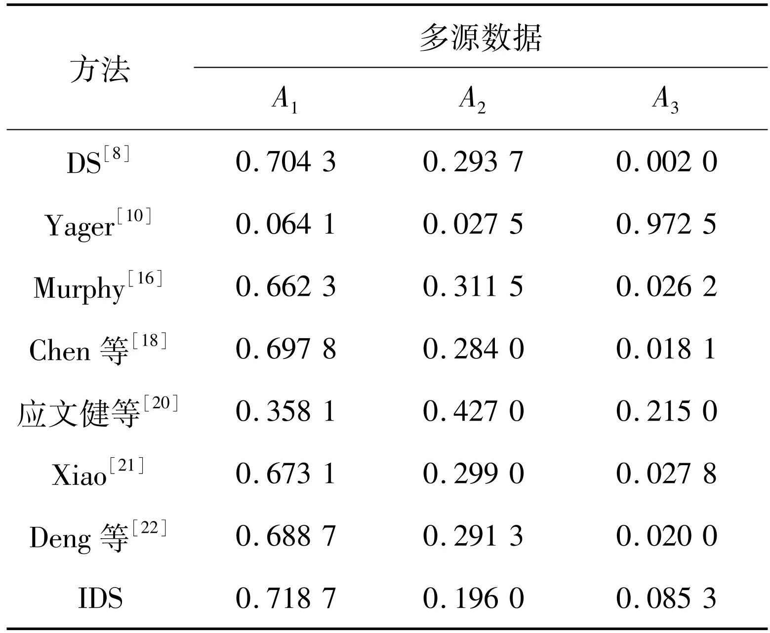 在完全冲突悖论中,已知冲突系数k=1,此时Dempster组合规则失效。由表2和图2可知,Yager[10]将BPA完全赋予了识别框架Θ,m(Θ)=1,证据融合后反而增加了命题的不确定性,无法正确识别目标命题A。其余方法均能正确识别目标命题A,其中,Murphy[16]和应文健等[20]的识别精度略低,分别为m(A)=0.837 5和m(A)=0.955 4,Chen等[18]、Xiao[21]、Deng等[22]和IDS的识别精度较高,均为m(A)=0.998 6。