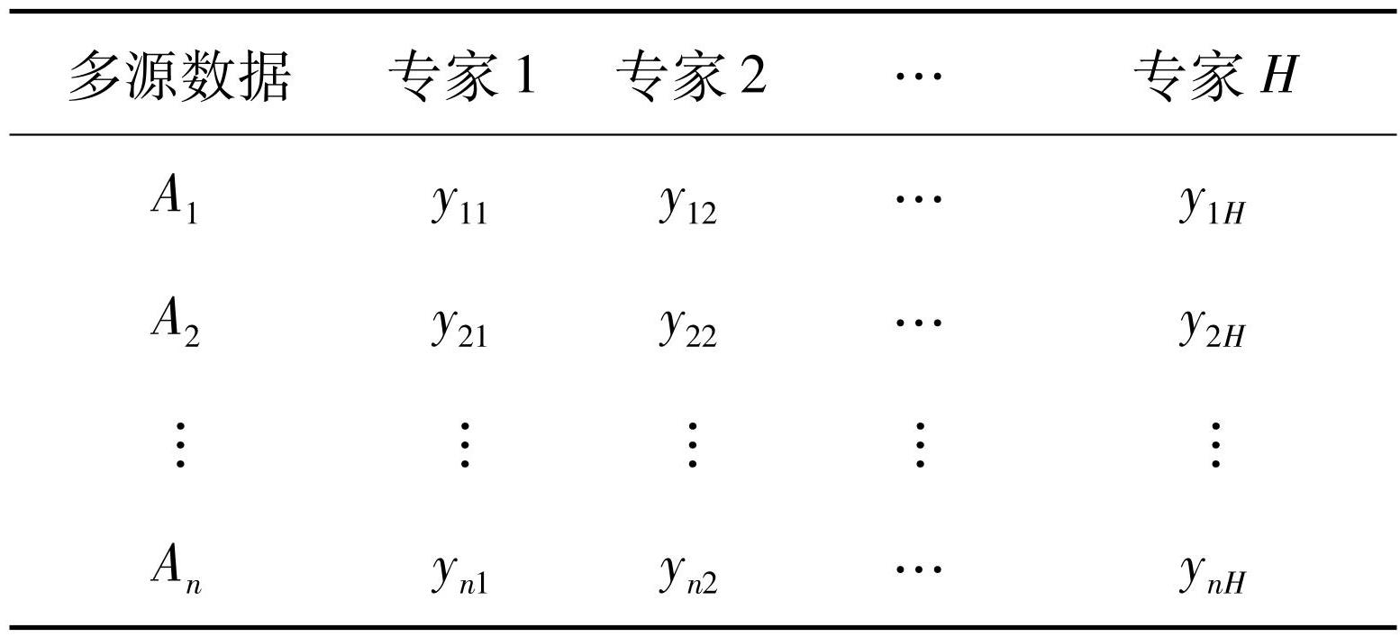 装备在其全寿命周期各阶段会产生各种各样的维修性试验数据,根据数据的来源、产生阶段和产生层级的不同,可以对多源数据进行不同分类,比如从来源维度上可将维修性数据分为:专家经验数据、仿真试验数据、历史试验数据、相似装备试验数据和不同环境试验数据。易知数据的来源不同,其反映装备维修性真实水平的能力不同,在数据融合时的重要程度显然也是不同的,数据越重要,对应数据源的融合权重应越大,即mass函数值应越大。借助专家经验采用1~9标度法对各源数据的重要度进行打分,构造基于数据重要度的mass函数,假设邀请H名专家分别对n种维修性数据A1,A2,···,An的重要度进行打分,如表1所示。