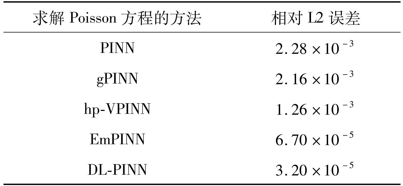 表2展示了使用EmPINN和DL-PINN方法与使用其他方法求解Poisson方程的比较结果。为了确保在不同方法之间进行公平比较,所有实验均使用了相同的超参数,如表1所示。实验结果显示,本文提出的方法EmPINN和DL-PINN求解Poisson方程的相对L2误差比PINN、gPINN和hp-VPINN低两个数量级,而DL-PINN方法的表现最佳,相对L2误差为3.20×10-5。