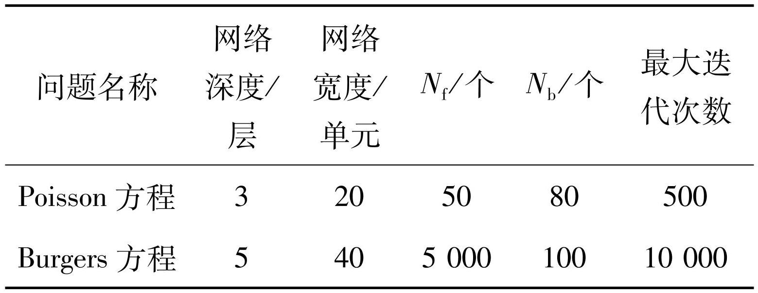 本节研究并比较EmPINN方法和DL-PINN方法与一些常用的基于深度神经网络的PDEs求解方法的性能,包括PINN、gPINN和hp-VPINN等,所有实验都在相同的实验环境下进行,每个示例使用的超参数在表1中进行了说明。在所有的示例中,使用tanh作为激活函数,学习率为0.001。为了最小化损失函数,使用自适应矩估计(adaptive moment estimation,Adam)优化器与限制内存的拟牛顿法-边界约束(limited-memory broyden-Fletcher-Goldfarb-Shanno box constrains,L-BFGS-B)优化器[21]相结合的优化策略:先使用Adam优化器应用于随机梯度下降训练,再使用L-BFGS-B优化器对结果进行微调。在训练过程中将TensorFlow和Numpy的随机种子设置为1 234,以确保实验结果的可重复性。